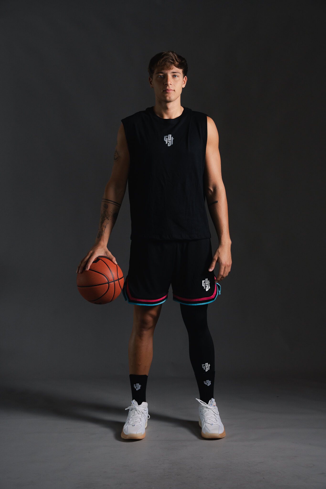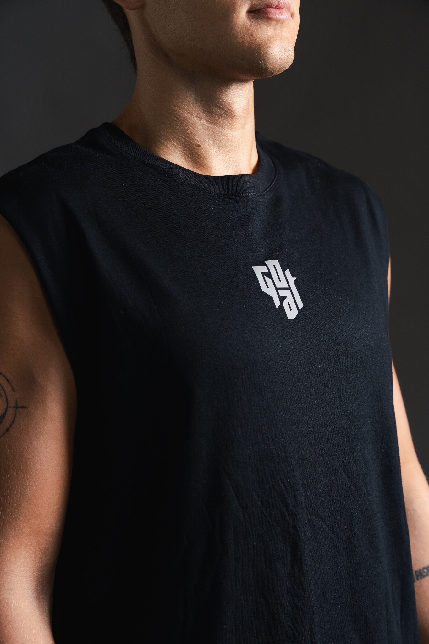 Musculosa de algodón de primer nivel con estampado GOAT en el frente. El modelo mide 1.80 y está usando talla L.
